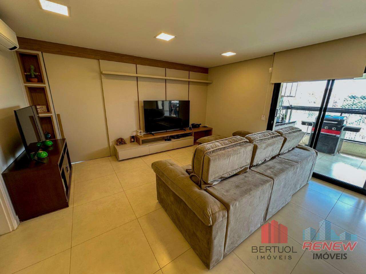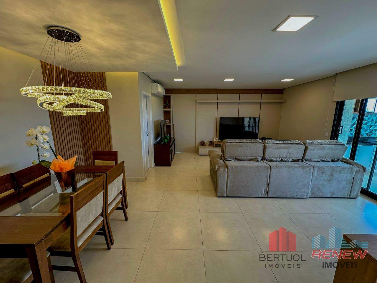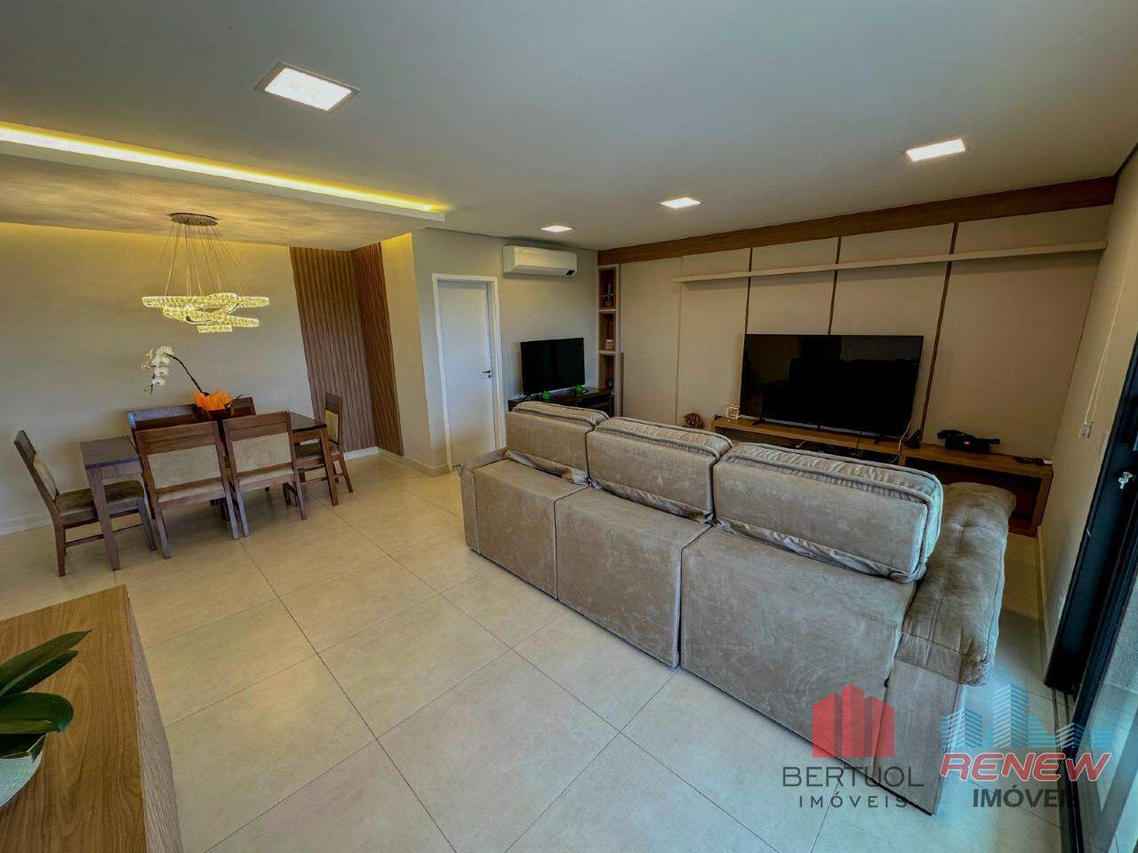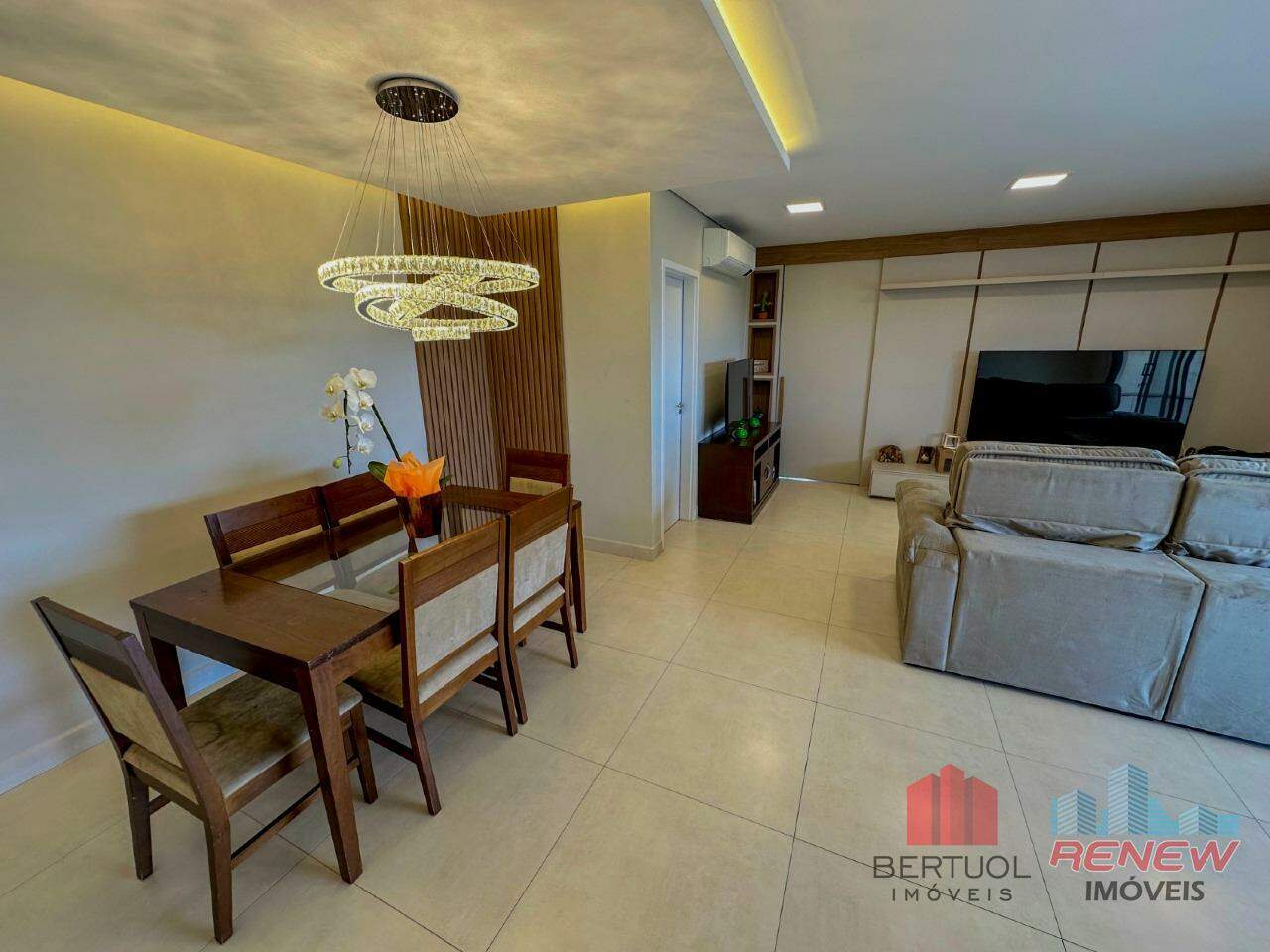 O apartamento oferece três suítes amplas, todas com armários planejados, além de lavabo, sala de TV e sala de jantar integradas, criando um ambiente sofisticado e acolhedor.