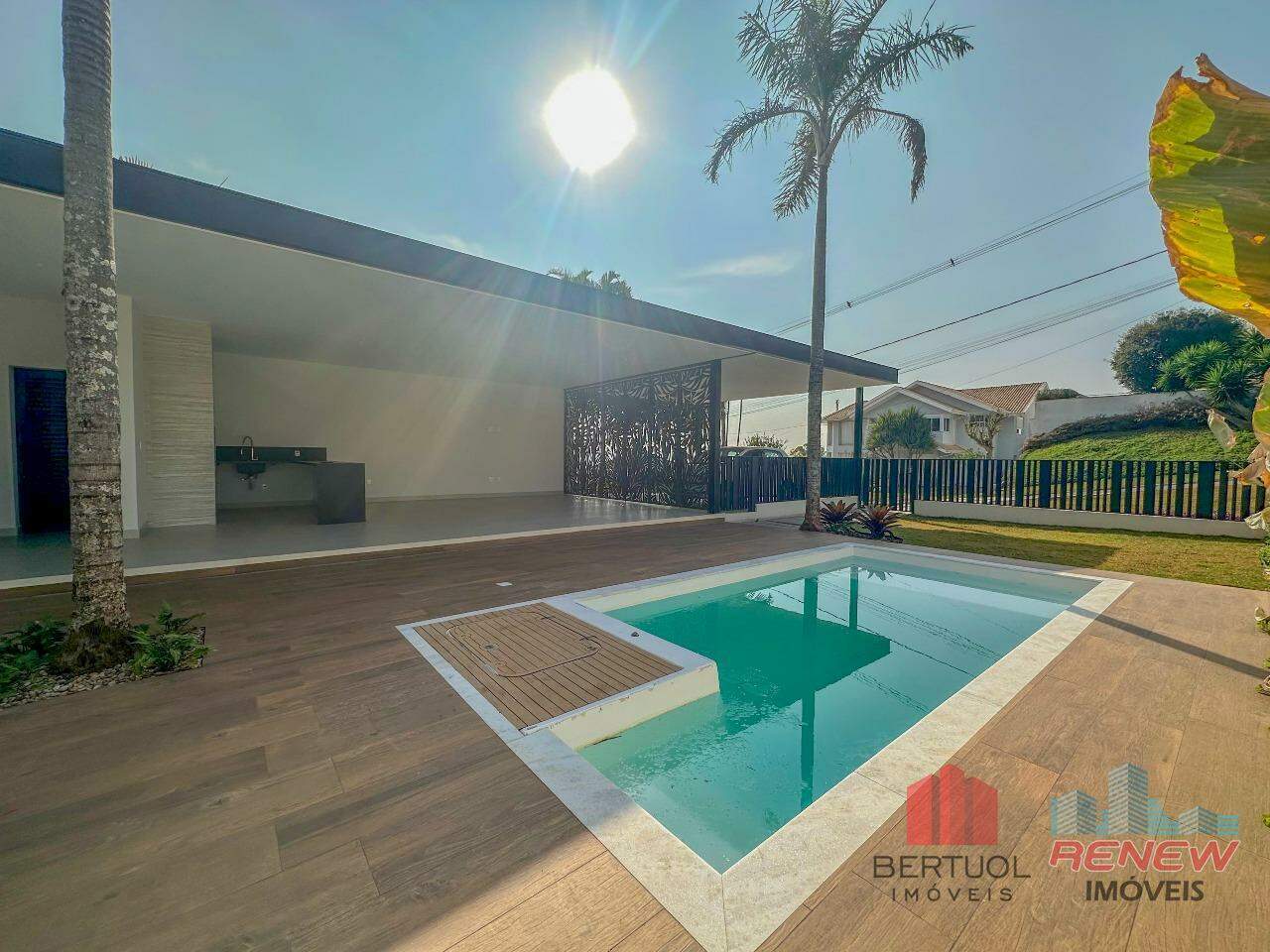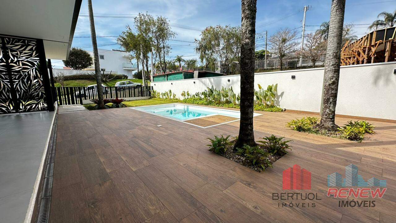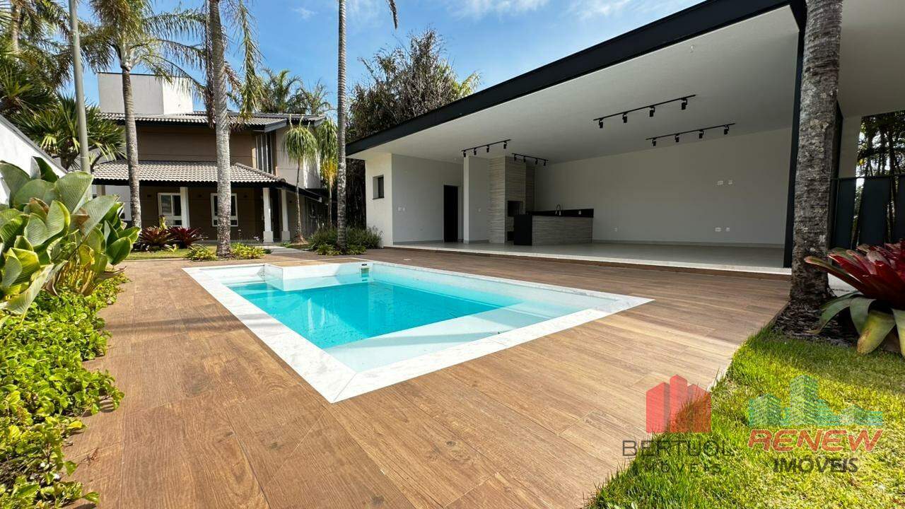 A área externa é um verdadeiro destaque: um lounge convidativo com lareira, uma piscina relaxante, uma área gourmet perfeitamente equipada para momentos gastronômicos memoráveis e uma garagem espaçosa para até quatro carros.