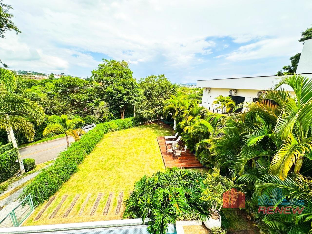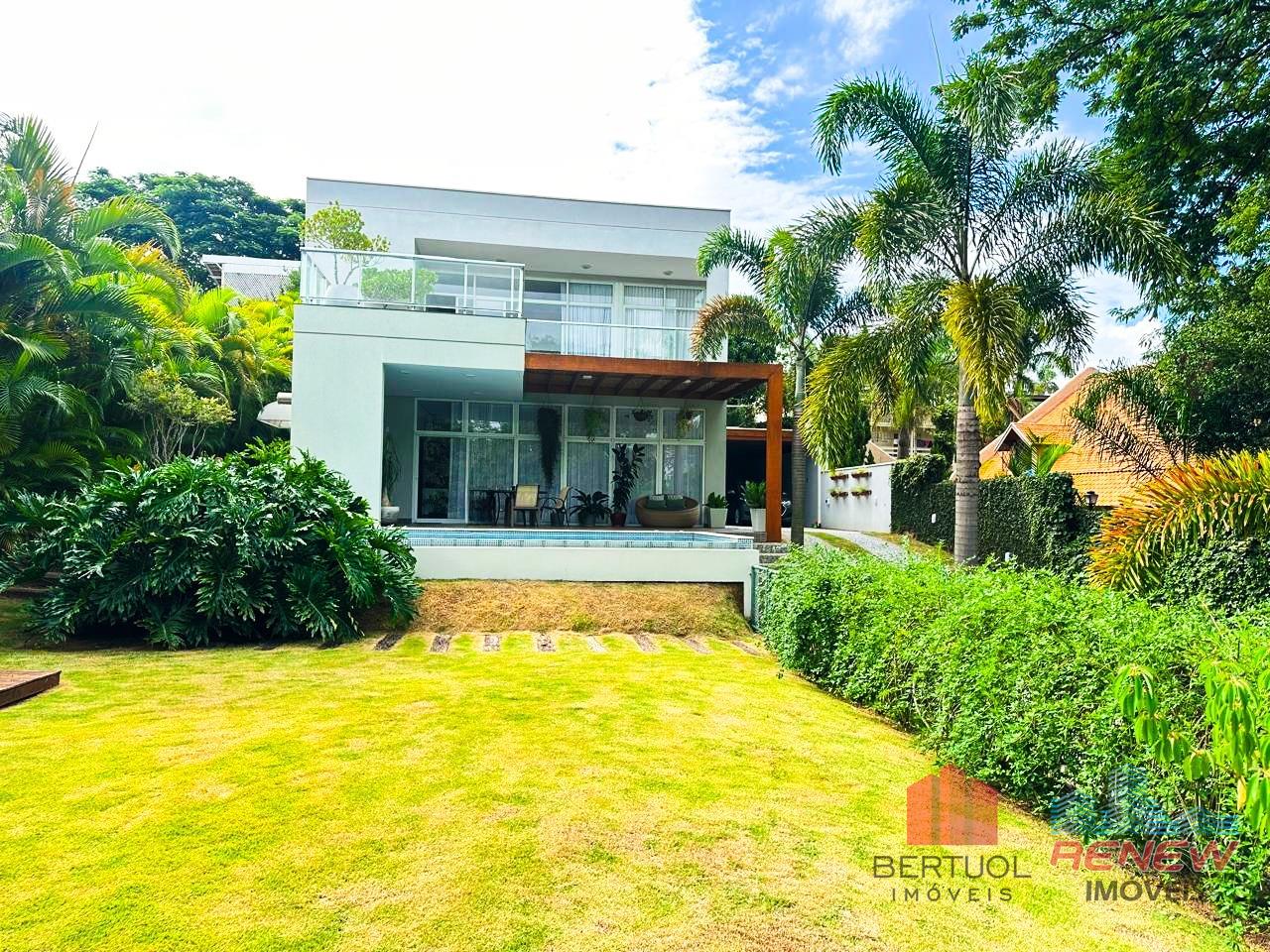 A área externa é um verdadeiro oásis, com piscina convidativa, amplo gramado ideal para lazer, recreação ou pets, além de paisagismo que valoriza ainda mais o contato com a natureza. O terreno proporciona excelente aproveitamento e privacidade.