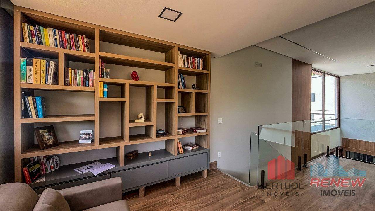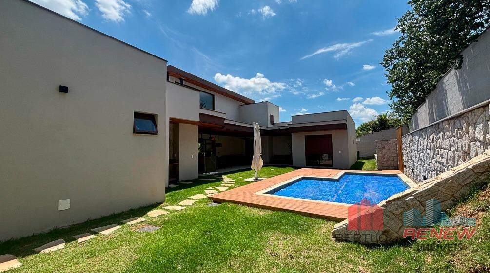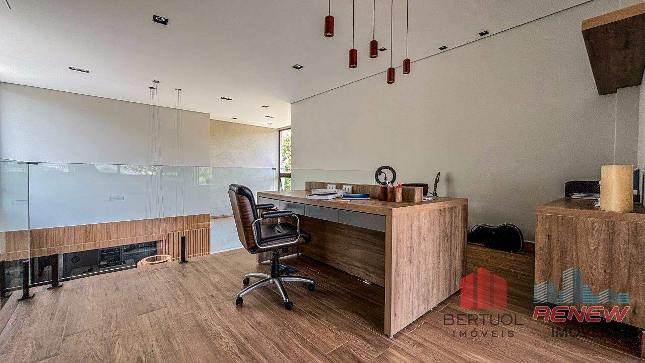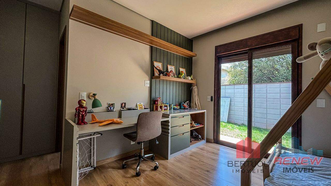 A cozinha, com ilha central, traz praticidade e um toque contemporâneo, sendo o coração do lar. Na área externa, a piscina convida ao lazer e ao relaxamento, complementando o clima acolhedor da casa. São quatro suítes amplas e bem planejadas, com armários embutidos e ótima iluminação. A suíte principal conta com closet e banheiro refinado, enquanto uma antessala conecta as suítes com conforto e fluidez. O mezanino é um diferencial, oferecendo um ambiente versátil que pode ser adaptado como escritório, sala íntima ou espaço de leitura, com uma vista panorâmica das áreas verdes do condomínio.