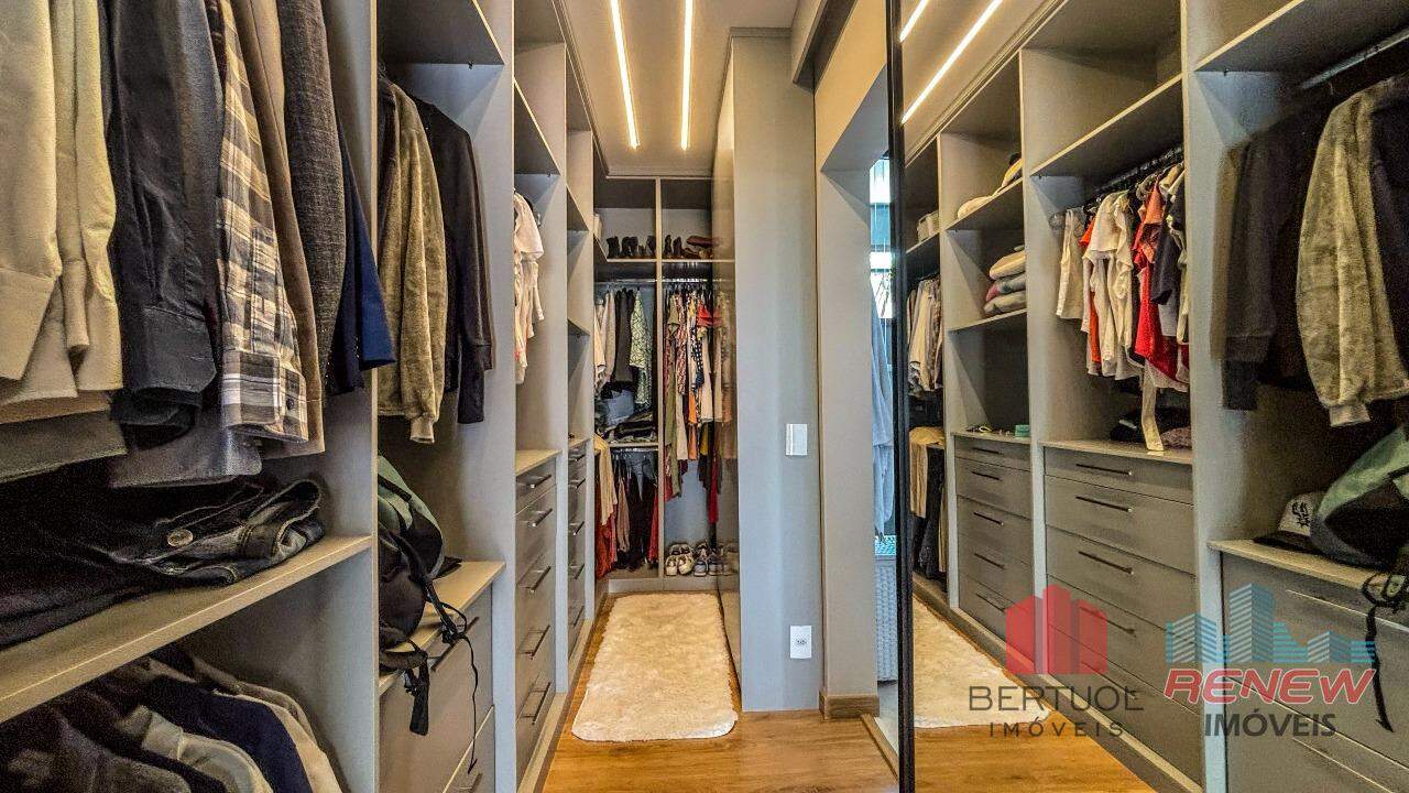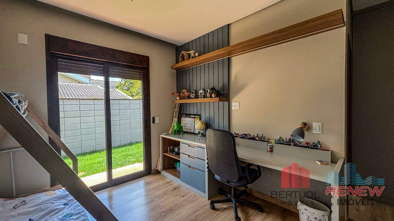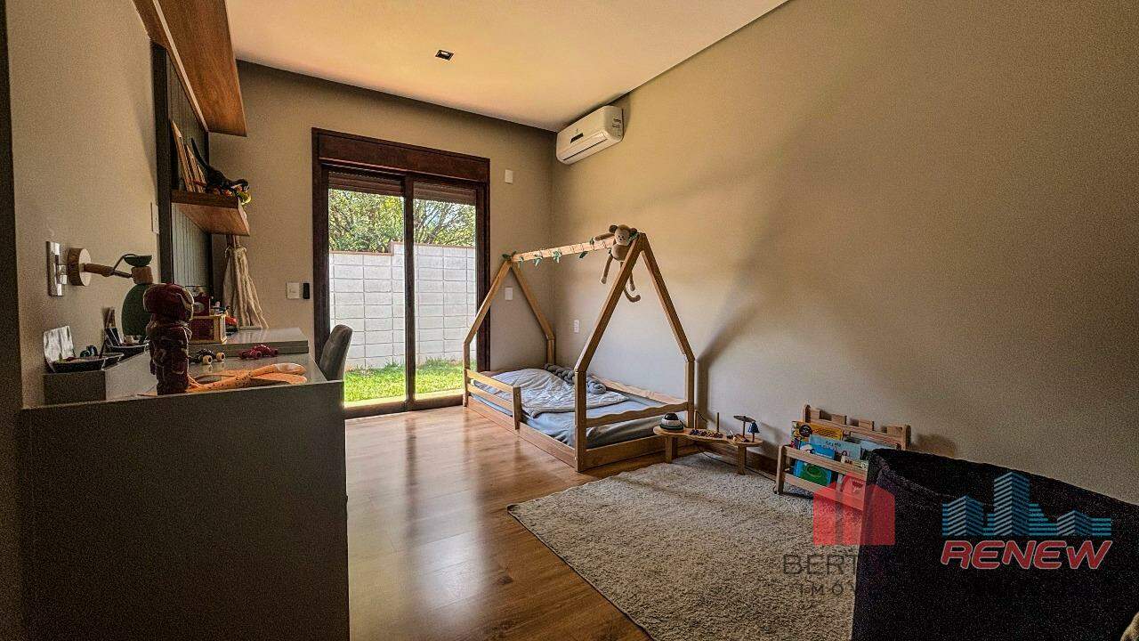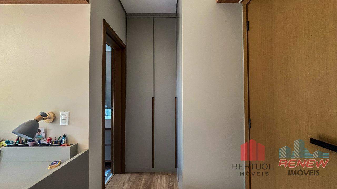 A cozinha, com ilha central, traz praticidade e um toque contemporâneo, sendo o coração do lar. Na área externa, a piscina convida ao lazer e ao relaxamento, complementando o clima acolhedor da casa. São quatro suítes amplas e bem planejadas, com armários embutidos e ótima iluminação. A suíte principal conta com closet e banheiro refinado, enquanto uma antessala conecta as suítes com conforto e fluidez. O mezanino é um diferencial, oferecendo um ambiente versátil que pode ser adaptado como escritório, sala íntima ou espaço de leitura, com uma vista panorâmica das áreas verdes do condomínio.
