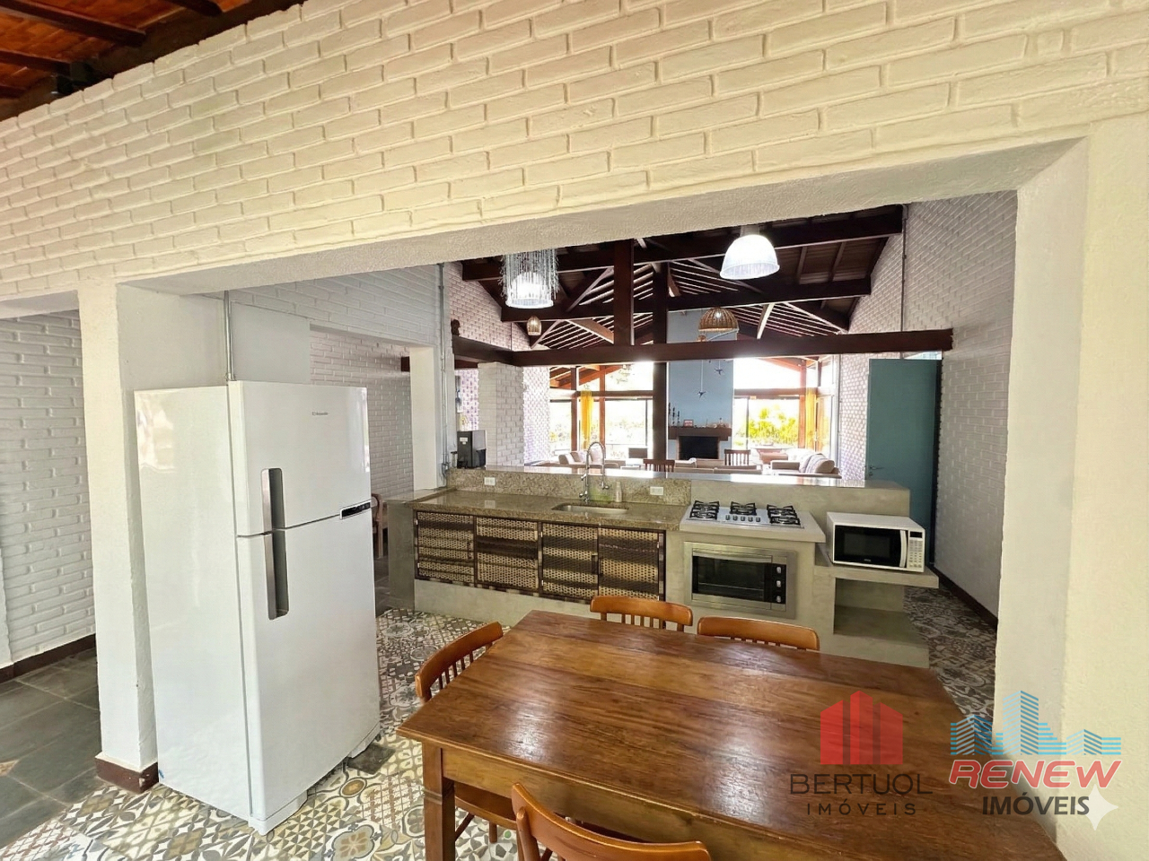 A área social foi planejada para proporcionar conforto e convivência. A sala de estar e a sala de jantar são integradas e se conectam à cozinha contemporânea em conceito aberto, ampliada e equipada com ilha central e acabamentos modernos. A varanda se torna um dos pontos mais agradáveis da casa, oferecendo uma vista encantadora para a natureza ao redor e criando o espaço perfeito para momentos de descanso.