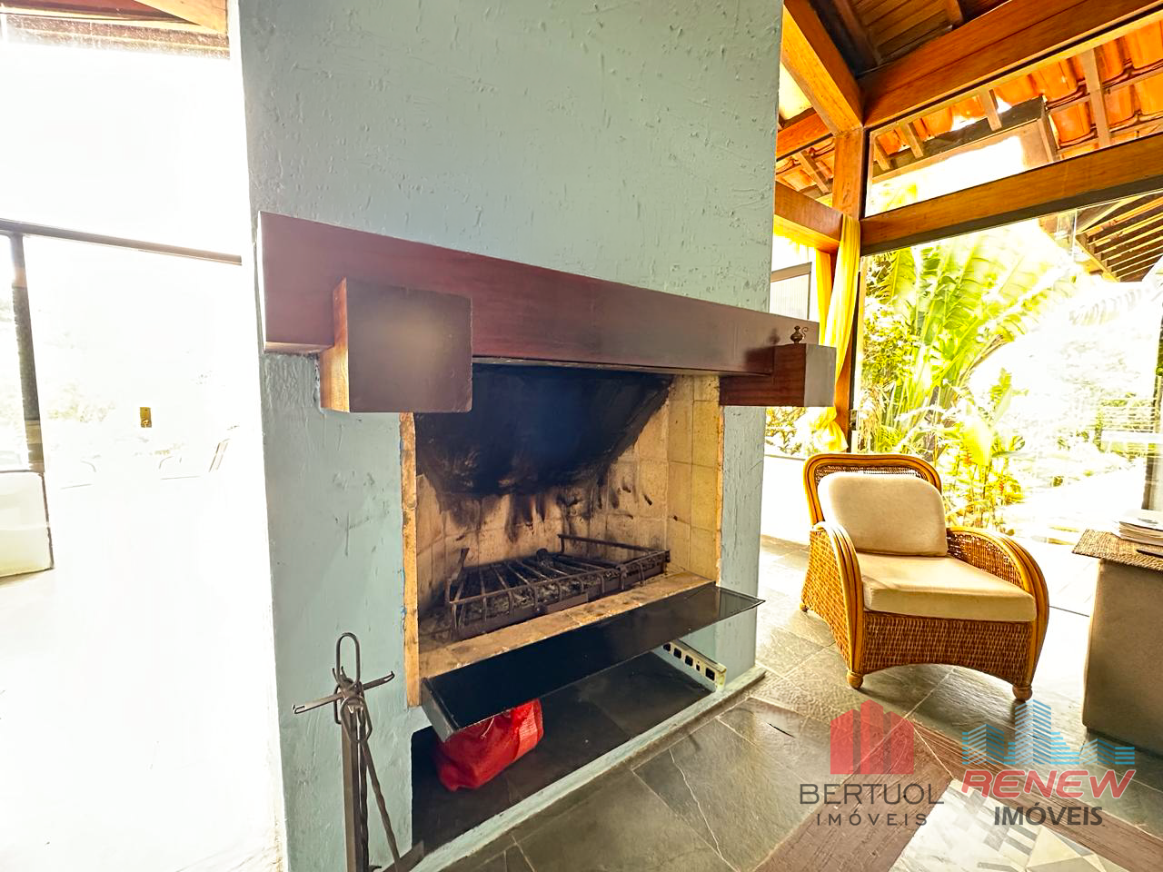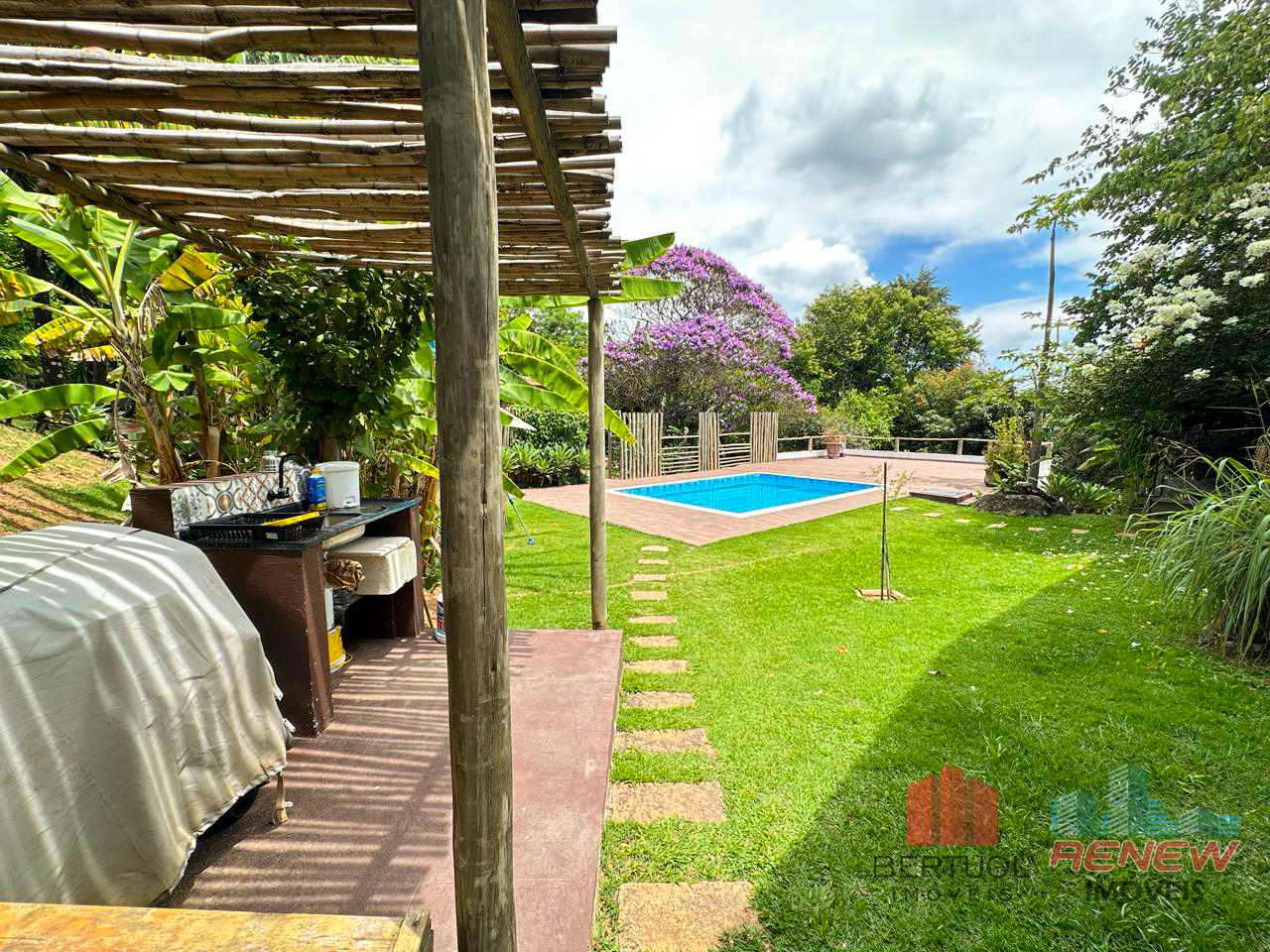 A área externa foi projetada para lazer e convivência. A piscina possui banheiro de apoio e está posicionada de forma estratégica para aproveitar a privacidade e a vista do terreno. Ao lado, a churrasqueira gourmet recém-construída cria o ambiente ideal para reunir amigos e familiares.