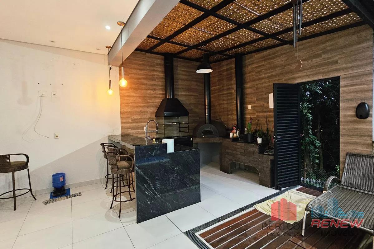 A área de lazer é um dos grandes destaques do imóvel, com um espaço gourmet completo equipado com churrasqueira, fogão a lenha e forno de pizza, ideal para receber amigos e familiares. O ambiente externo ainda conta com piscina e acesso aos fundos do condomínio com ligação direta à área de mata, proporcionando uma sensação única de privacidade e contato com a natureza. O imóvel dispõe de 3 vagas de garagem, sendo 2 cobertas e 1 descoberta.