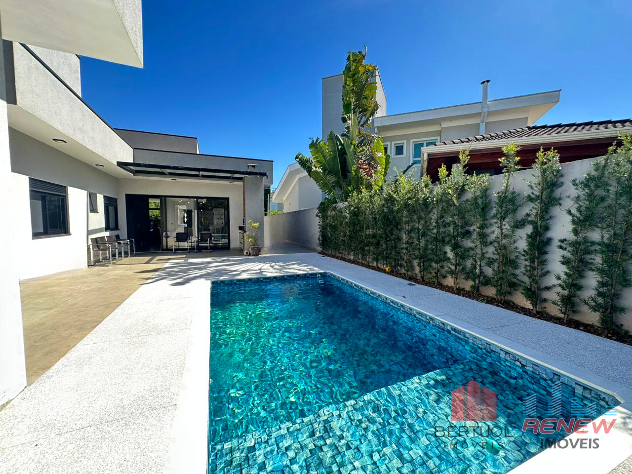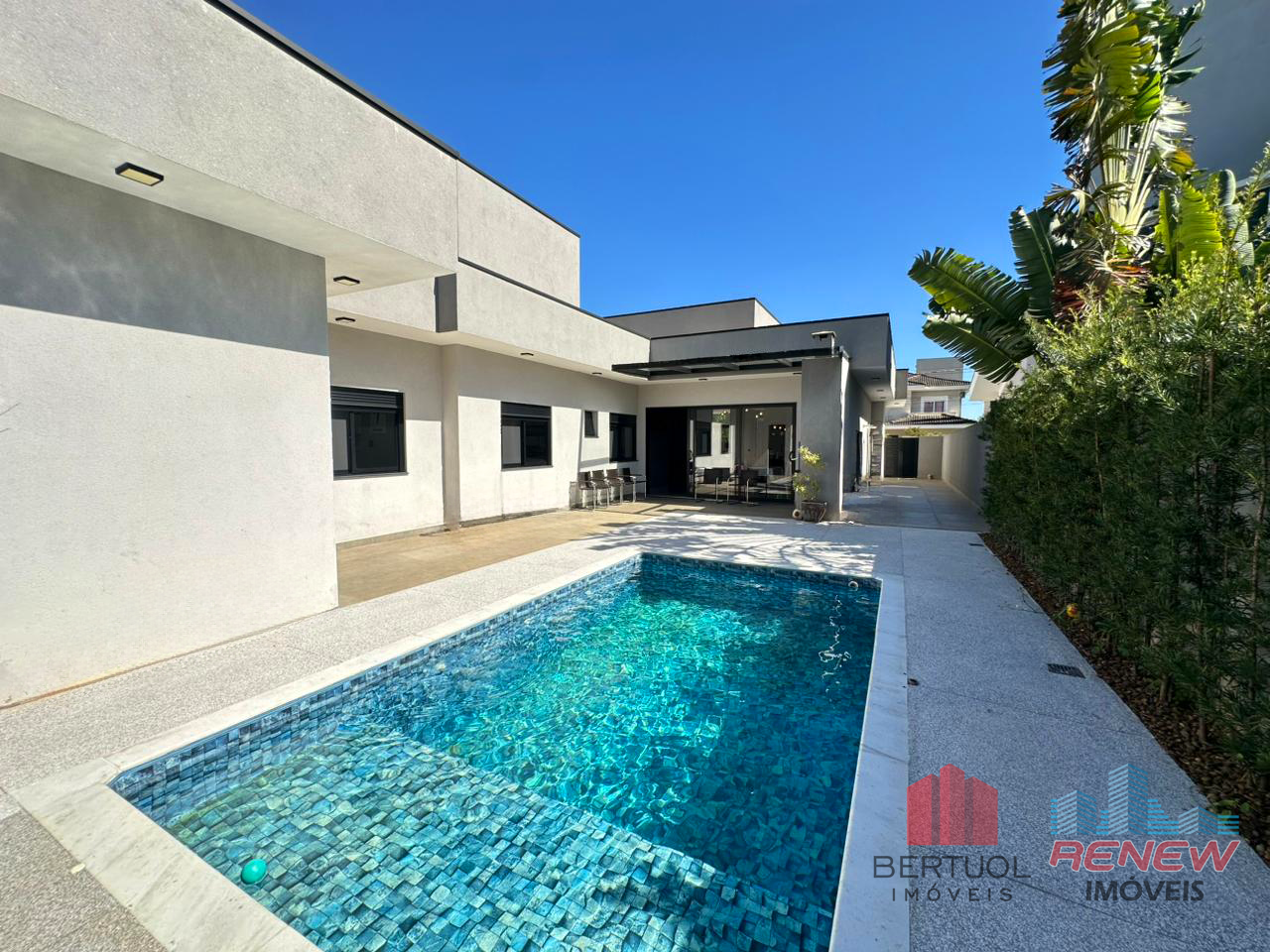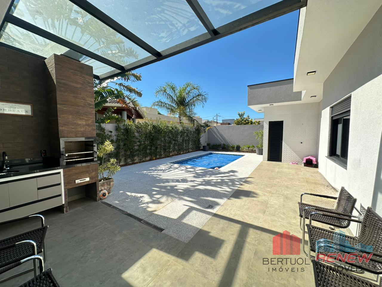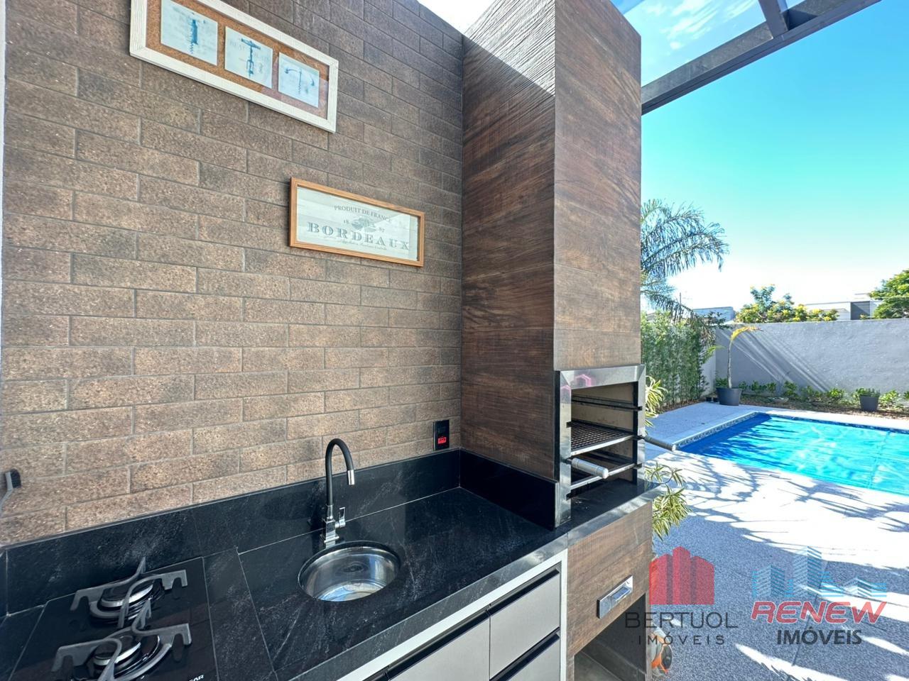 Do lado de fora, o espaço gourmet com churrasqueira convida para almoços em família e encontros entre amigos. A piscina ao lado do jardim paisagístico completa o cenário ideal para relaxar nos dias ensolarados. Há ainda um banheiro e um quarto externo, que podem servir como apoio ou acomodação extra para hóspedes.