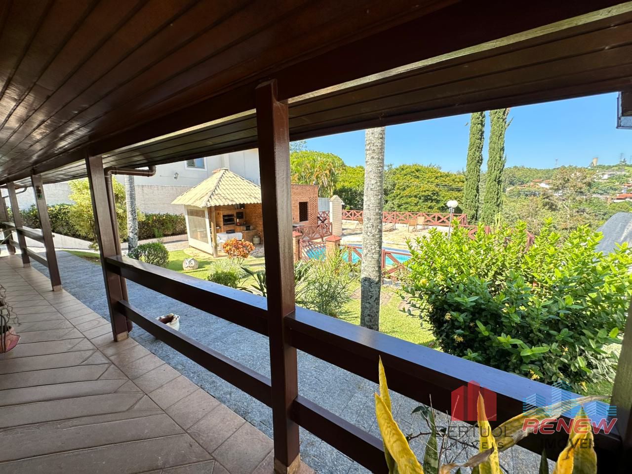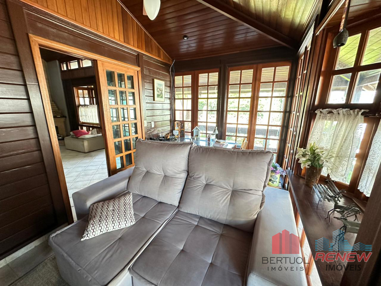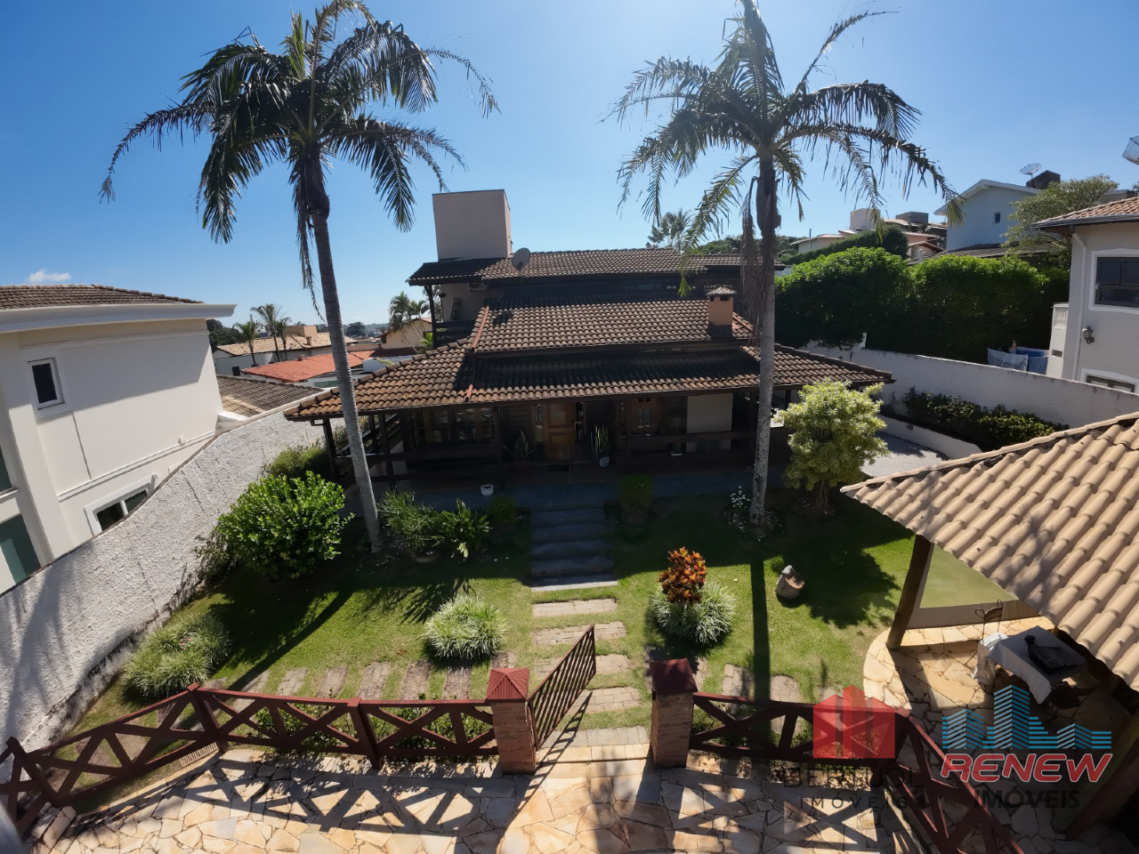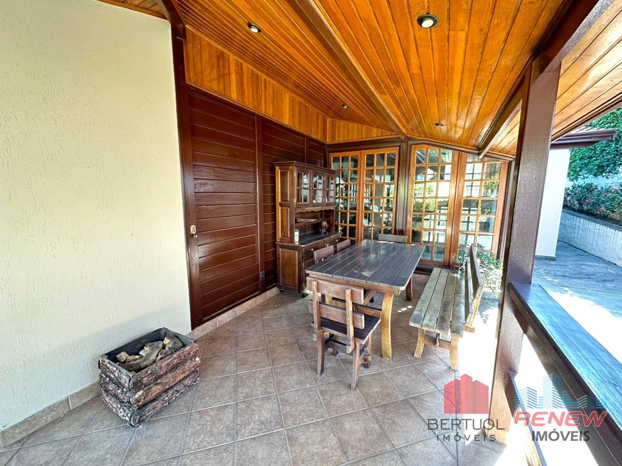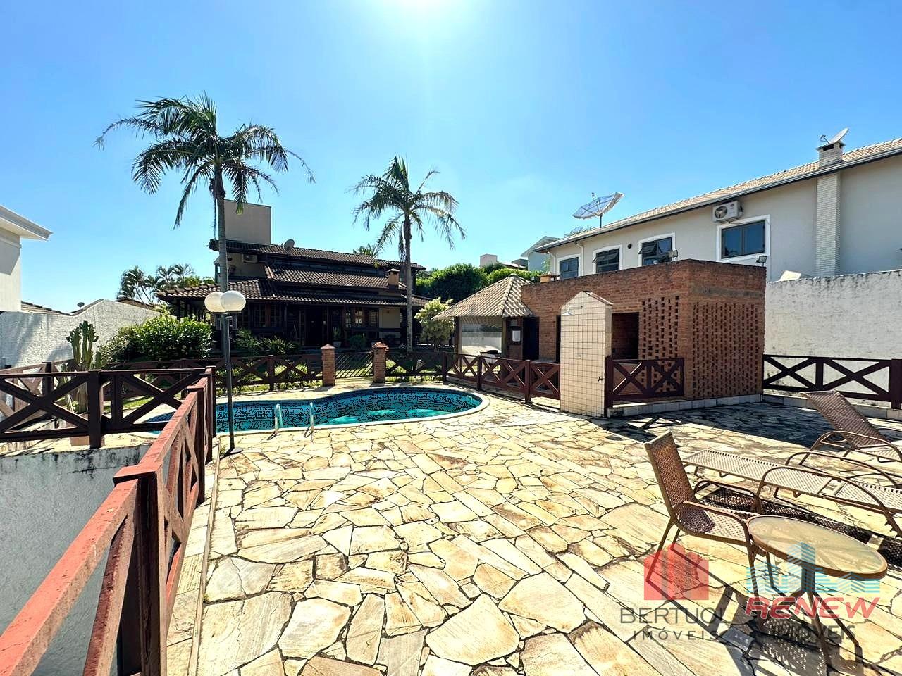 O imóvel conta com quatro dormitórios, sendo duas suítes, incluindo uma suíte master no piso superior com closet, hidromassagem e varanda privativa. Possui três salas amplas com pé direito alto, lareira e excelente iluminação natural, além de lavabo e banheiro adicional com hidromassagem. A cozinha americana com piso em porcelanato é integrada e funcional, acompanhada de despensa, área de serviço e suíte de apoio. Toda a casa é avarandada, favorecendo ventilação cruzada e conforto térmico.